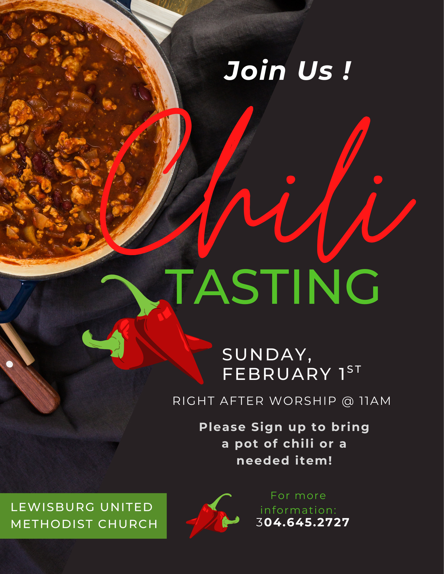 For more info: Call Church Office – 304-645-2727